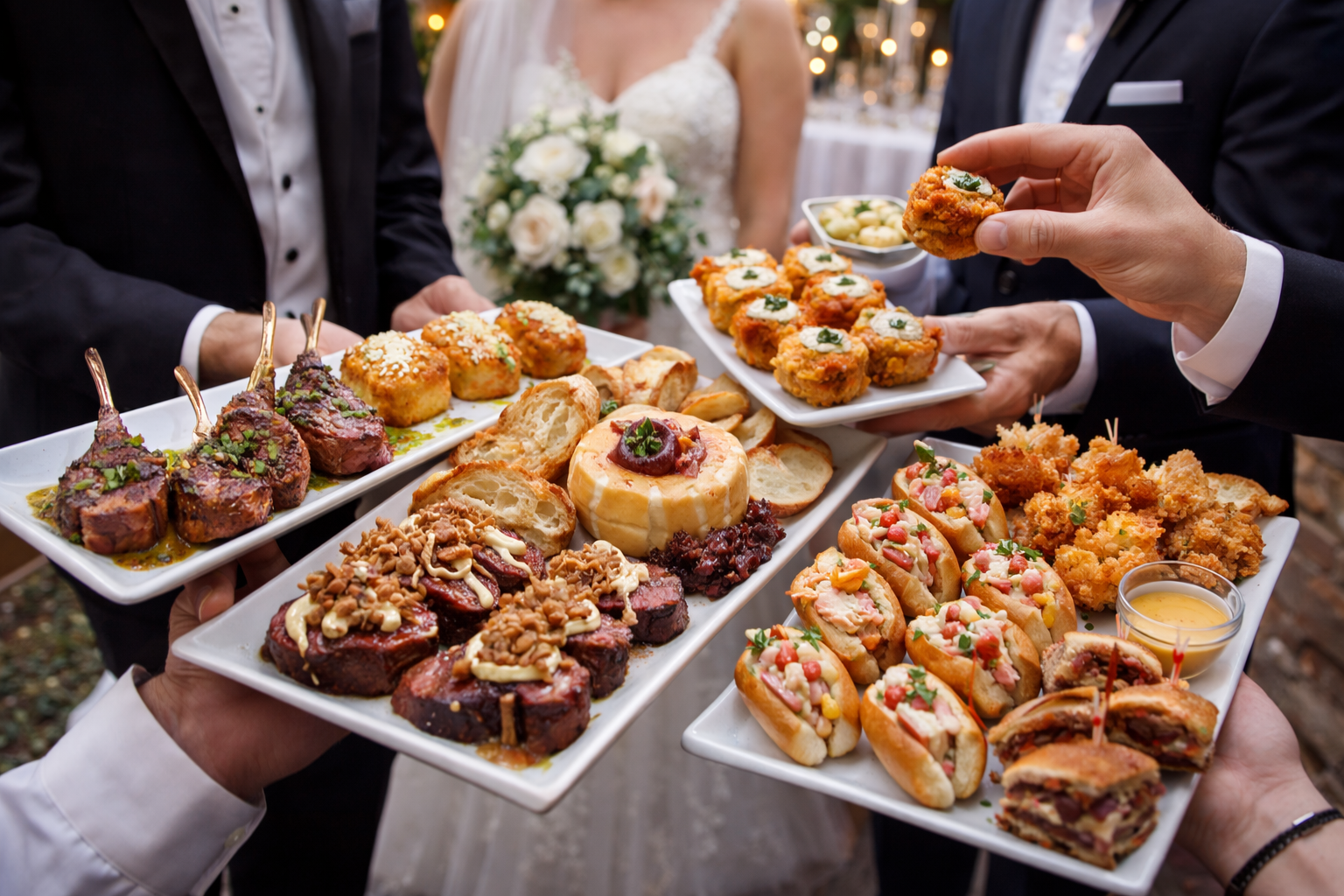 We’re starting the night off right with an open bar and several hot and cold food stations, including a surprise chef station. Waitstaff will be passing around some of the following Hors D’oeuvres: