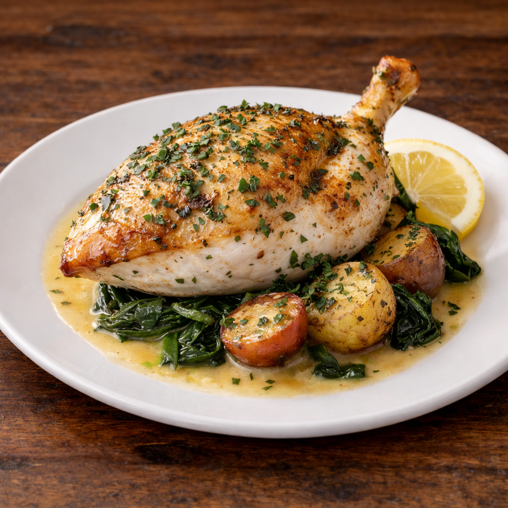 Roasted airline chicken breast with lemon herb de provence, roasted garlic beurre blanc