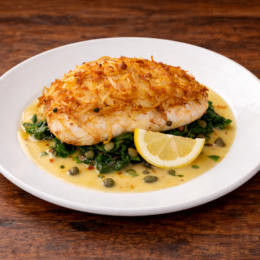Potato crusted grouper with a lemon garlic sauce