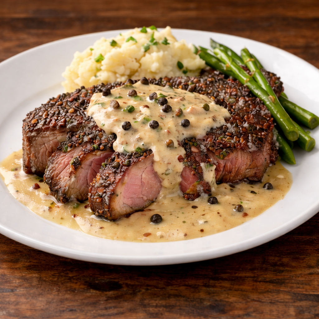 Roasted NY strip steak au poivre with a peppercorn brandy cream sauce